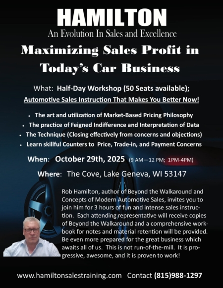 Rob Hamilton, author of Beyond the Walkaround and Concepts of Modern Automotive Sales, invites you to join him for 3 hours of fun and intense sales instruction. Each attending representative will receive copies of Beyond the Walkaround and Concepts of Modern Automotive Sales, as well as a comprehensive workbook for notes and material retention. Be even more prepared for the great business which awaits all of us. This is not run-of-the-mill. It is progressive, awesome, and it is proven to work!